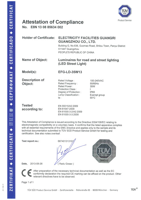 ??? 近期,,,我公司下属企业广州w66利来电气装备有限公司获得由德国南德意志(TUV-SUD)揭晓的萧洒路灯(型号为EFG-LD-35W13)CE认证证书,,,意味着w66利来电气此款路灯产品取得了进入欧洲市场的资格。。。。。。。